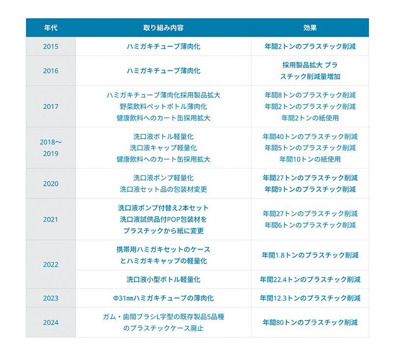 毎日何気なく手に取っているハミガキ。実はそのパッケージの内側で、サンスターは10年以上にわたり地道な環境対応を続けてきました。そのひとつが、ハミガキチューブの薄型化によるプラスチック使用量を削減する取り組みです。サンスターは2030年までに、容器・包装に使用する石油由来プラスチックの50%以上を、植物由来またはリサイクルプラスチックへ切り替える目標を掲げています。これと並行し、努力を重ねてきたのがチューブそのものの「薄型化・軽量化」です。2015年から段階的に進めてきた薄型化が徐々に成果を上げ、2022年には携帯用ハミガキセットのケースとキャップの軽量化により、年間約1.8トンのプラスチックを削減しました。さらに2023年には、Ora2プレミアムペーストのハミガキチューブの厚みを310μmから240μmへと約23%薄型化し、こちらは年間約12.3トンもの削減に成功。地道に石油由来プラスチックの削減を進めています。